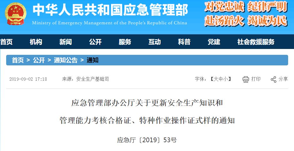 根据国家最新发布的消息,中华人民共和国应急管理部于2019年8月10日发布了《应急管理部办公厅关于更新安全生产知识和管理能力考核合格证、特种作业操作证式样的通知》“应急厅〔2019〕53号文件,对安全生产知识和管理能力考核合格证和特种作业操作证的式样进行了更新。