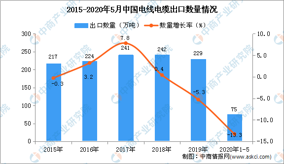 随着全球市场的持续增长,尤其是发展中国家需求的较快增长,行业领先企业逐步开始重视国外市场的开发,凭借出色的产品质量和性价比优势电线电缆行业出口量由2009年的143万吨上升至2018年的242万吨,年均复合增长率约为6.02%,我国电线电缆行业出口规模稳步扩大。受新冠肺炎疫情影响,电线电缆出口量有小幅度下降,2020年1-5月我国电线电缆出口量为75万吨,同比下降13.3%。
